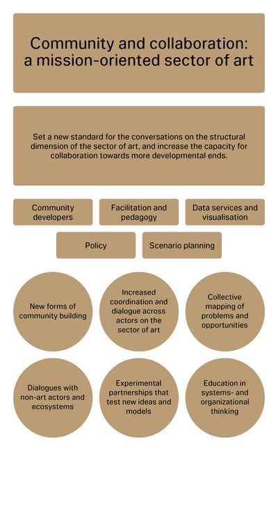 Hvis vi ønsker et mere robust og bedre koordineret billedkunstfelt, i stand til at undergå fortløbende strukturel forandring, er der behov for dialoger på tværs af hele feltet. Denne mission vil starte nye samtaler om den strukturelle dimension af billedkunstfeltet i Danmark, på tværs af vores medlemmer, interesseorganisationer, kunstinstitutioner, private og offentlige fonde samt den bredere offentlighed.