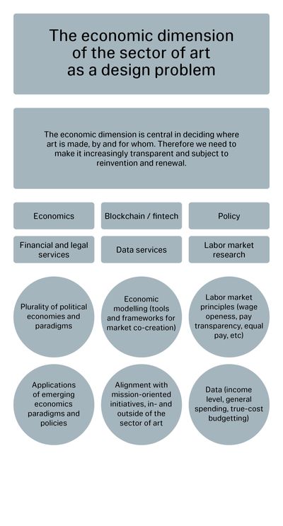 Den økonomiske dimension af billedkunstfeltet er central i forhold til at bestemme hvor, hvorfor, af og til hvem, billedkunst laves. Formålet med denne mission er at udvikle et nyt vidensgrundlag, der kan give os en bedre forståelse for betydningen af billedkunstfeltets økonomi og dets indvirken på fagets udvikling, og på baggrund heraf, at give perspektiver for hvordan vi kan udvikle og designe nye økonomiske modeller og strukturer.