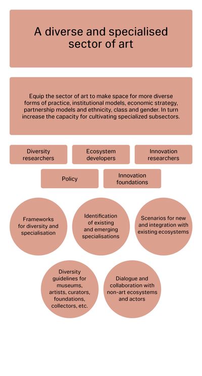 Specialisering er koblet med diversitet i den forstand at hvis vi bliver i stand til at skabe plads for diversitet i alle dets former, vil vi se mere specialiserede afgrene af billedkunstfeltet vokse frem. Eksempler her kunne være det spirende samarbejde billedkunstfeltet i Danmark har med sundhedssektoren (e.g. udsmykninger, projekter med mentalt udsatte), det offentlige rum og byudvikling, kunst, videnskab og teknologisk udvikling, sociale indsatser, m.m. Disse eksempler peger på situationer hvor billedkunstnere træder ind i sammenhænge, hvor de skal lære mange nye færdigheder, og vi mener, at vi i højere grad kan blive bedre til at dele erfaringer og støtte denne type af projekter.