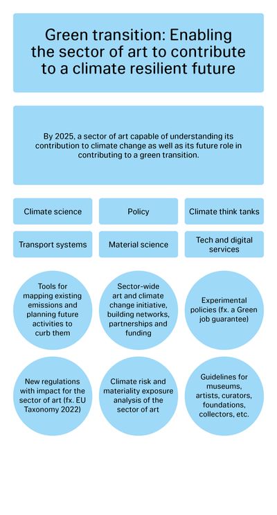 Udstyre billedkunstfeltet med værktøjer og frameworks der vil muliggøre at aktører (billedkunstnere, institutioner, gallerier, samlere, etc.), forstår hvordan de bidrager til klimaforandringer
